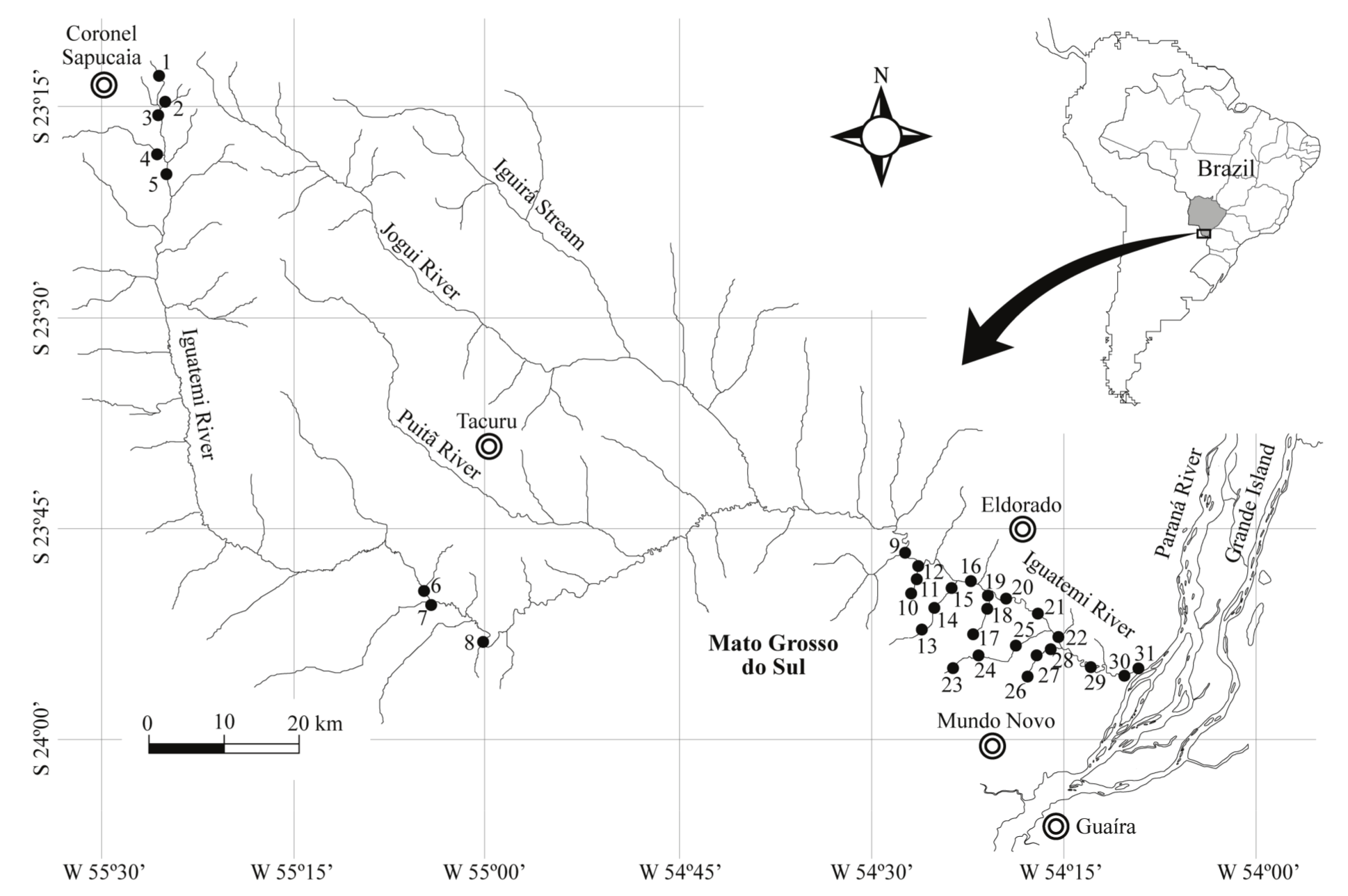 Thirty-one sampling sites were established in the Iguatemi River basin, as follows: i) thirteen sites were located in the Iguatemi River channel; ii) three in each of the streams Guaçú, Douradão, Água Boa, Perobão and Santa Maria, comprising the upper, intermediate and lower stretches thereof, totaling 15 sites and; iii) one site in each of the streams Comprida, Nhu-Verá and Cerro-Verde (Figure 1).