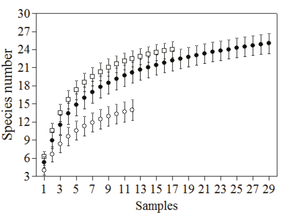 The genus accumulation curves did not reach the asymptote (Figure 2). The estimated richness (Jackknife 1) for the basin was 29.8 Odonata genera,