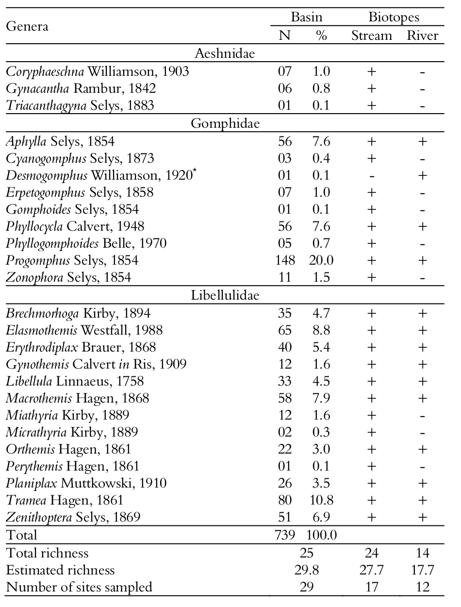 Considering that knowledge of the basic characteristics of biological assemblages is the first step for the development of effective conservation policies (Súarez et al., 2011), this study present an inventory of the genera of immature Odonate-Anisoptera found in lotic environment of the Iguatemi River basin, upper Paraná River, Mato Grosso do Sul State, Brazil. Thus, this survey should serve as a reference for the region, partially supplying a biogeographic gap in the knowledge of the Odonata fauna of this basin.