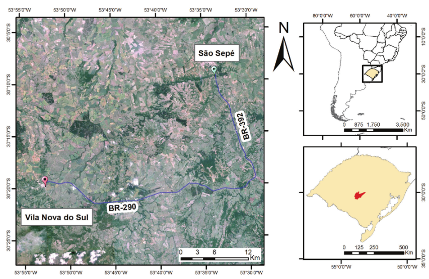 This study was carried out in a stretch of BR-392 and BR-290 highways. BR-392 crosses São Sepé city and connects with BR-290 towards Vila Nova do Sul. This stretch was considered as continuous in this study (Figure 1). The study area is located in the Pampa Biome in the central portion of the state of Rio Grande do Sul. The area presents a mischaracterization of its physiognomy due to the expansion of agriculture, extensive cattle ranching, monoculture (Instituto Brasileiro de Geografia e Estatística [IBGE], 2016) and to hunting pressure, still common in the region (Corrêa, Silva, Pazinato, & Mello, 2013). Such impacts on the biome contribute to the decline and isolation of wild populations, which in some cases are already under threat of extinction (Fontana, Bencke, & Reis, 2003, Corrêa, Silva, & Cappellari, 2010, Corrêa et al., 2013).
