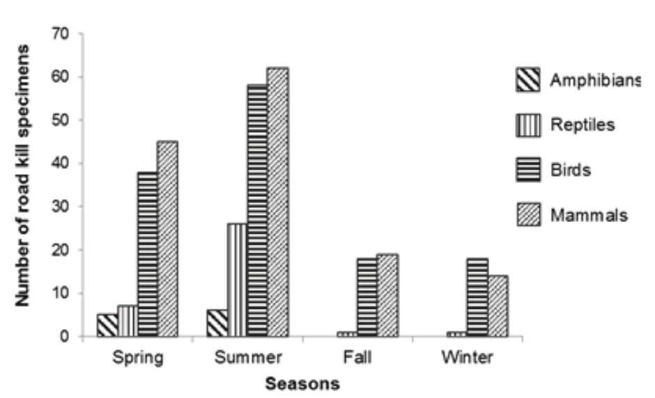 The seasonal comparison of road kill abundance revealed statistically significant differences in the number of dead individuals. Summer and spring months presented a greater number of carcasses, respectively. Months with milder temperatures (fall and winter) showed about 71% less road kills than warmer months. Accordingly, to Cerqueira (2005), climate variation influences primary productivity and consequently resource availability in the food chain. This increase in biomass raises individual abundance and therefore the risk of collisions during months with plentiful resources (summer and spring), when compared to months of restricted food intake (winter and fall). Vehicle flow also becomes more intense in the summer (Camargo et al., 2011), making collision risk even higher in this season.