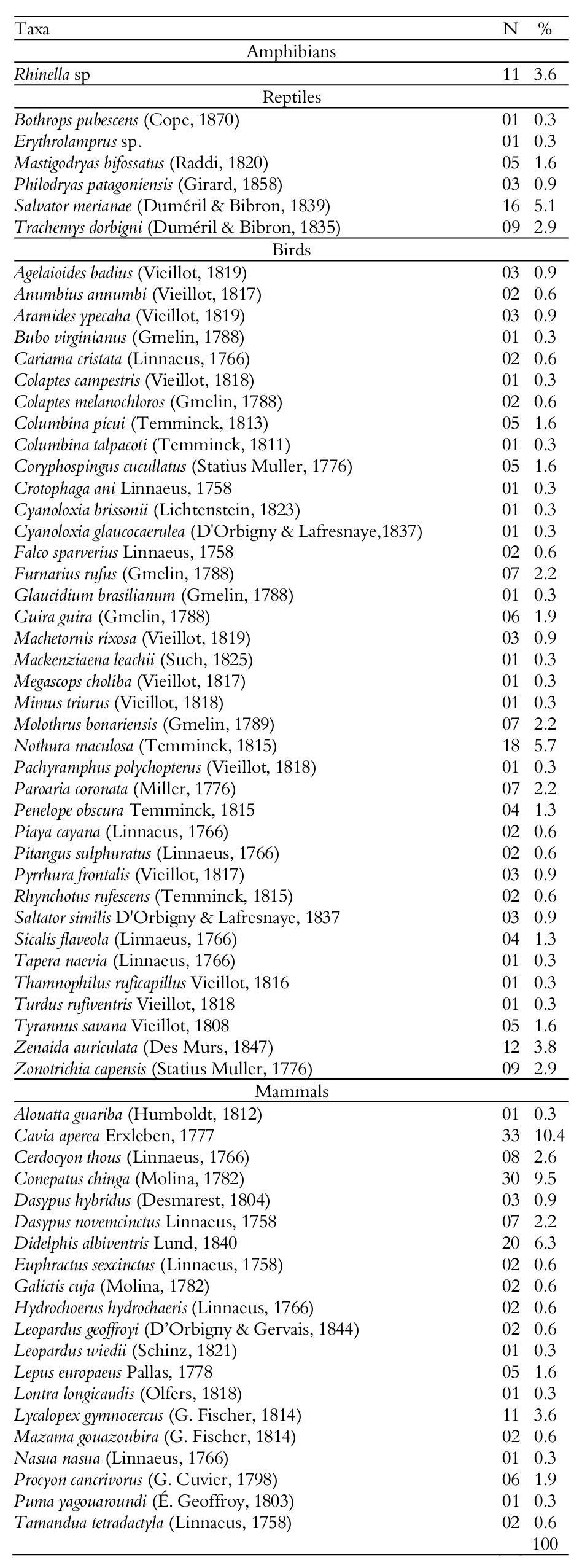 Along a year, 318 road killed vertebrates belonging to 65 species were registered. Of these, 38 species were birds, 20 were mammals, six were reptiles and one was anuran (Table 1). Vertebrates showed a mortality rate of 0.147 specimens per traveled kilometer, (i.e., an individual each seven kilometers). This rate was similar to those in other studies (Table 2). The most abundant species were Cavia aperea (10.4%), Conepatus chinga (9.5%), Didelphis albiventris (6.3%), Nothura maculosa (5.7%) and Salvator merianae (5.1%).