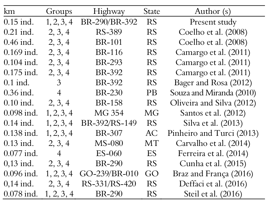 Several studies, such as those performed by Camargo, Mazim, and Garcias, (2011), Hartmann, Hartmann, and Martins (2011), Coelho, Teixeira, Colombo, Coelho, and Kindel (2012), Santana (2012), Carvalho, Bordignon, and Shapiro (2014), Secco, Ratton, Castro, Lucas, and Bager (2014) and Deffaci et al. (2016) highlight the issue of wildlife road kill in Brazil, reporting which taxa present higher mortality rates. This wide range of publications works both as a warning to authorities and as a source of information for decision-making in the construction and adaptation of highways in Brazil (Teixeira