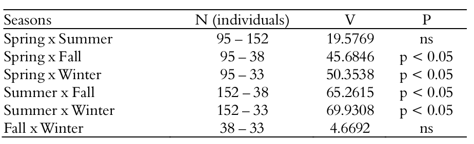 Among the records of this study, Leopardus geoffroyi, Leopardus wiedii, Puma yagouaroundi, Alouatta guariba, Nasua nasua and Tamandua tetradactyla are under the ‘Vulnerable’ threat category in the state of Rio Grande do Sul (Fontana et al., 2003, FZB, 2014). In relation to seasonality of abundance, the pairwise comparison showed that spring and summer were the seasons with greater occurrence of road killed animals (Figure 2;Table 3).