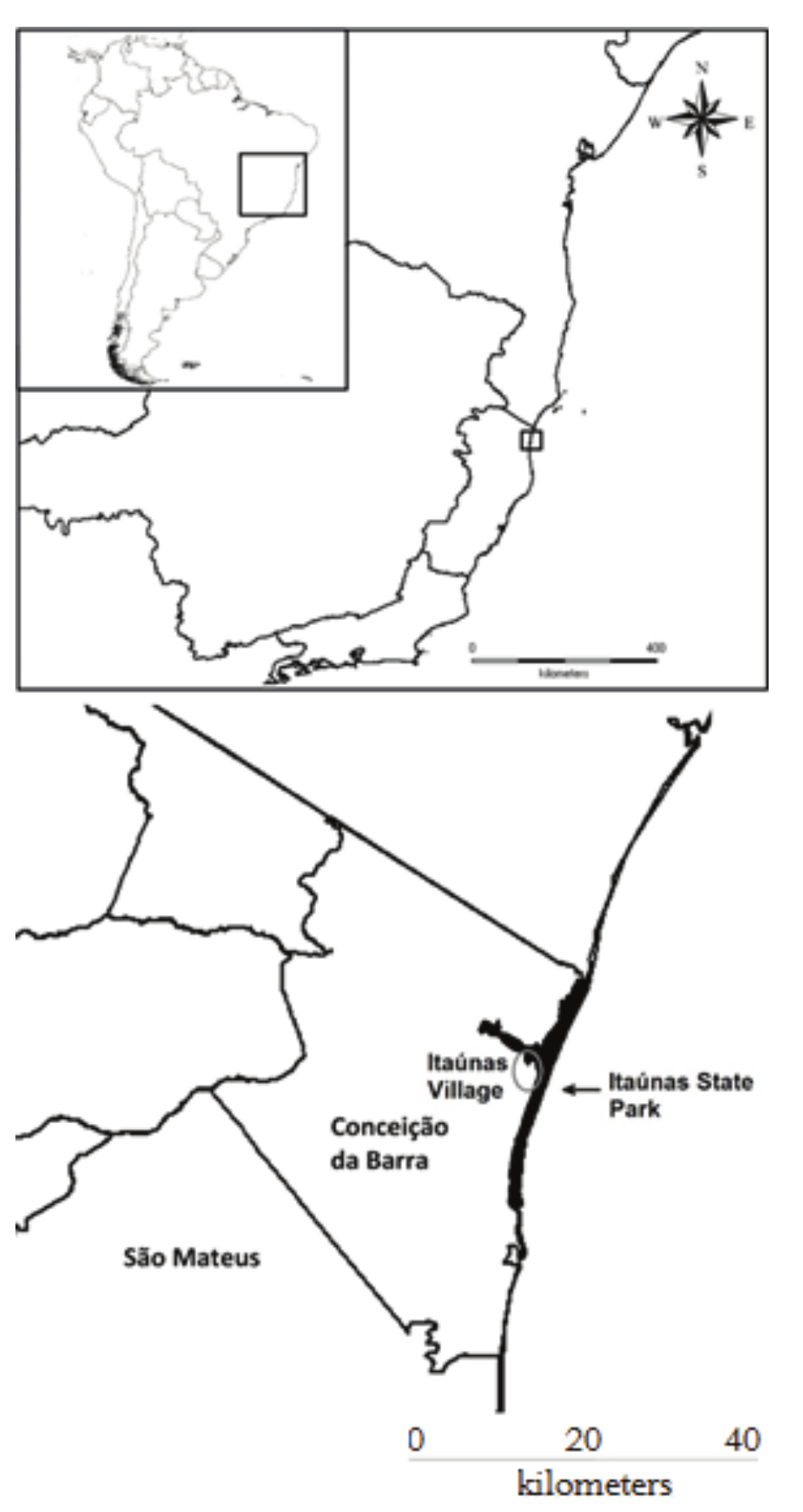 This research was carried out in 2009 and 2010, with Artisanal fishers that lived around (Itaúnas village) and inside in the Itaúnas State Park, belonging to the municipality of Conceição da Barra, northern Espírito Santo, Brazil (Figure 1). Conceição da Barra was raised to municipality status in 1891 and the Itaúnas village was acknowledged in 1911 (Instituto Brasileiro de Geografia e Estatística [IBGE], 2014).