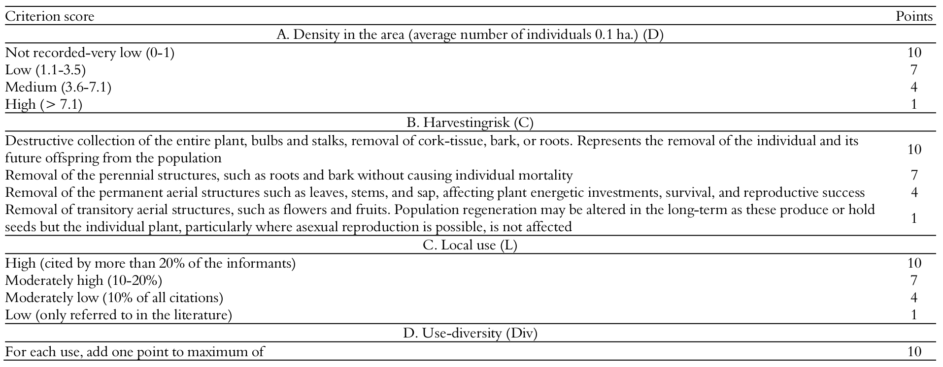 Other quantitative method used is the conservation priority index (Dzerefos & Witkowski, 2001, Oliveira et al., 2007, Crepaldi & Peixoto, 2010), in which species more threatened by possible human use intensity are pointed out (Dzerefos & Witkowski, 2001). This index provides information about the sustainability of harvesting of the plants considered useful to local population (Oliveira et al., 2007) and support best discussion about conservation priorities this vegetation species (Crepaldi & Peixoto, 2010).