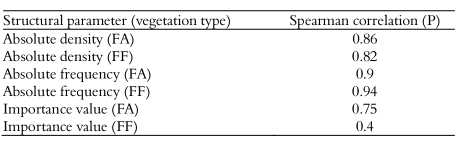 The relation between the use-value and structural parameters (importance value, absolute density and frequency) was evaluated in both phytophysiognomies, through non-parametric linear Spearman correlation, using the software Past (Hammer, Harper, & Ryan, 2001).