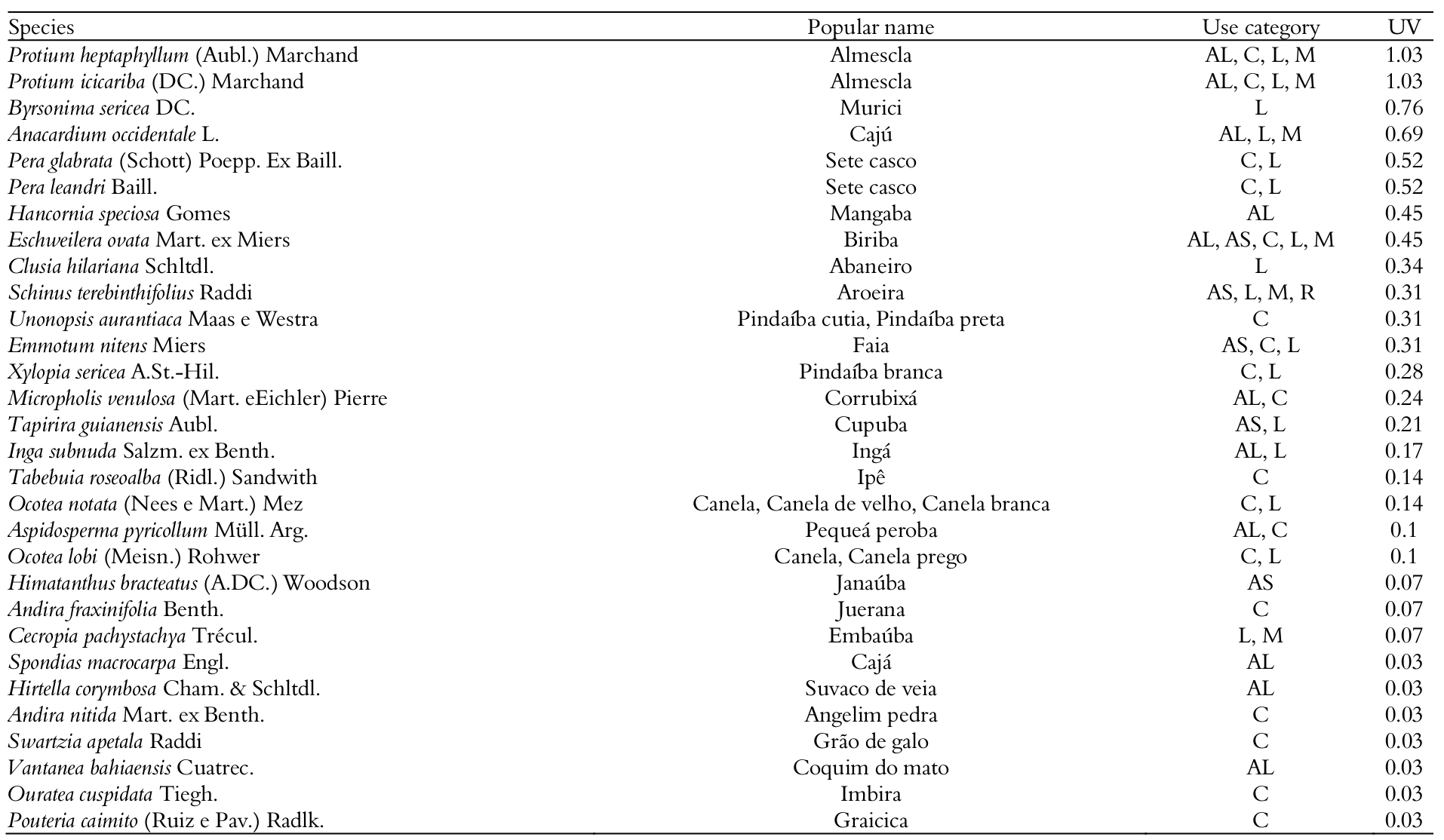 The highest use-values (UV) were observed for Protium heptaphyllum (1.03), Protium icicariba (1.03), Byrsonima sericea (0.76) and Anacardium occidentale (0.69 - Table3). The first three occur in both formations and A. occidentale is exclusive to the shrubby formation. P .heptaphyllum, Ocotea notata and Clusia hilariana had the biggest Importance Values (IV) among woody species from the Shrubby Formation (SF) (Monteiro et al., 2014). Protium heptaphyllum, Ocotea lobi and Tapirira guianensis had the highest IVs on Forest Formation (FF) (Giaretta et al., 2013).