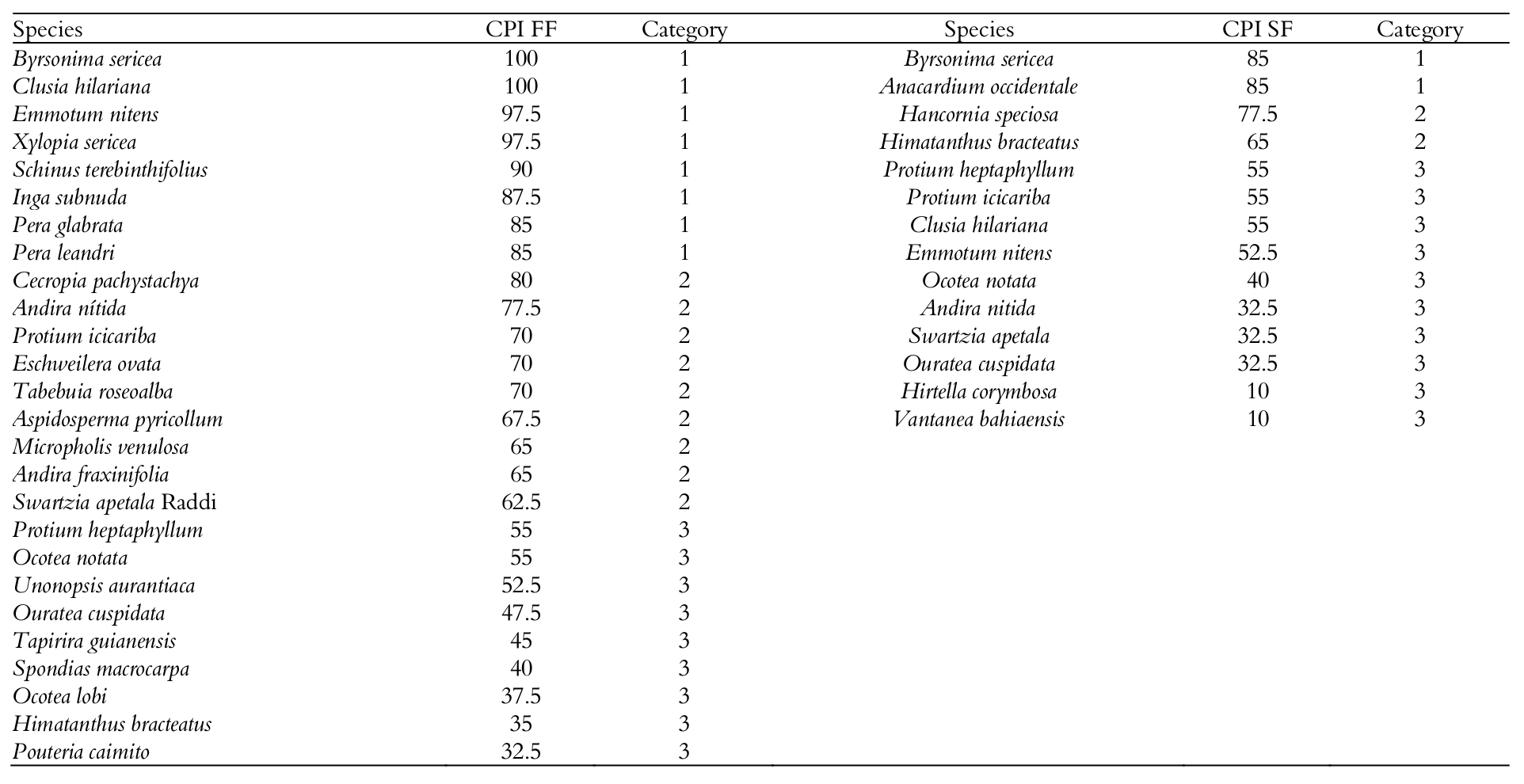 In the open shrubby formation, two species meet the Category 1 of the Conservation Priority Index (CPI) and in the forest formation eight species had high values (Category 1) for conservation priority, Byrsonima sericea and Clusia hilariana presenting the maximum value (100) (Table 4).