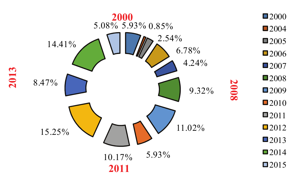 The Impact Factor (JCR) and the Scopus indexed database are the most widely used and comprehensive classification criteria for collecting citations and grouping high impact articles. The survey indicated 48% of articles published in journals with impact factor between 0 and 0.6 (Figure 5b), with most publications between 0.3 and 0.5. Within the national standard, that is, of the impact factors exhibited by the most respected national journals, generally being between 0 and 1.2, these values are considered reasonable.