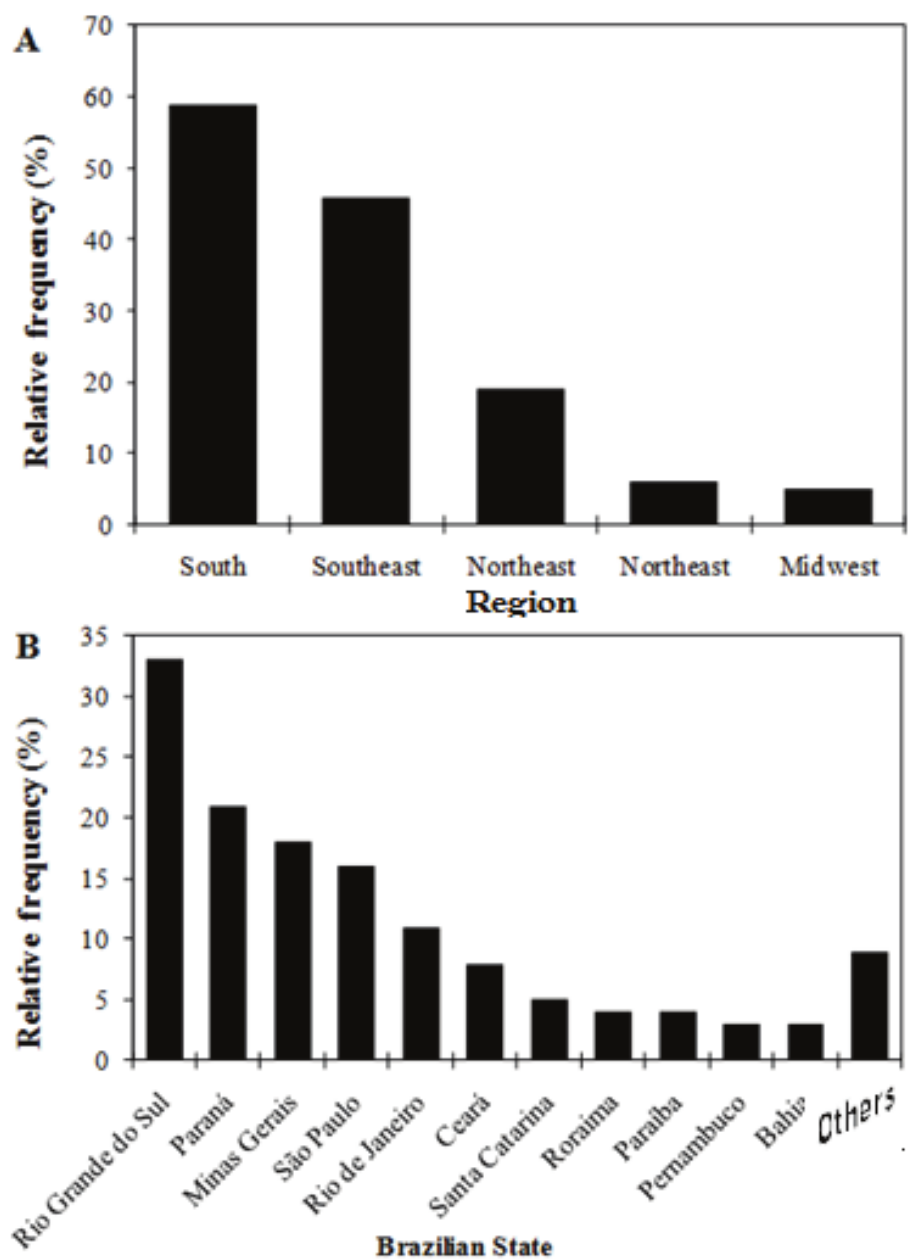 Most of the authors have affiliation in Federal and State Universities, in different Brazilian regions, totaling 62 Teaching Institutions in 18 different states. The publications frequencies, divided by region, are described in Figure 2a. The South (43%)