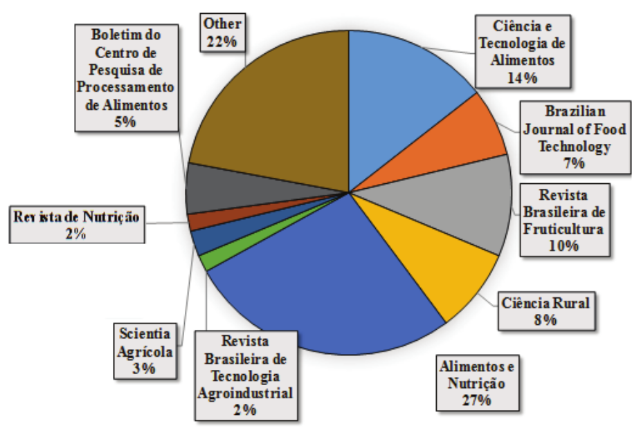 The main Brazilian journals utilized to publish the articles were Ciência e Tecnologia de Alimentos (Campinas - São Paulo), Revista Brasileira de Fruticultura (Jaboticabal - São Paulo) and Alimentos e Nutrição (Araraquara-São Paulo), with more than 50% of the publications (Figure 4). Other journals, less cited, but with a good percentage were the Brazilian Journal of Food Technology (Campinas - São Paulo), Boletim do Centro de Pesquisa e Processamento de Alimentos (B. Ceppa) (Curitiba-Paraná) and Ciência Rural (Santa Maria-Rio Grande do Sul).