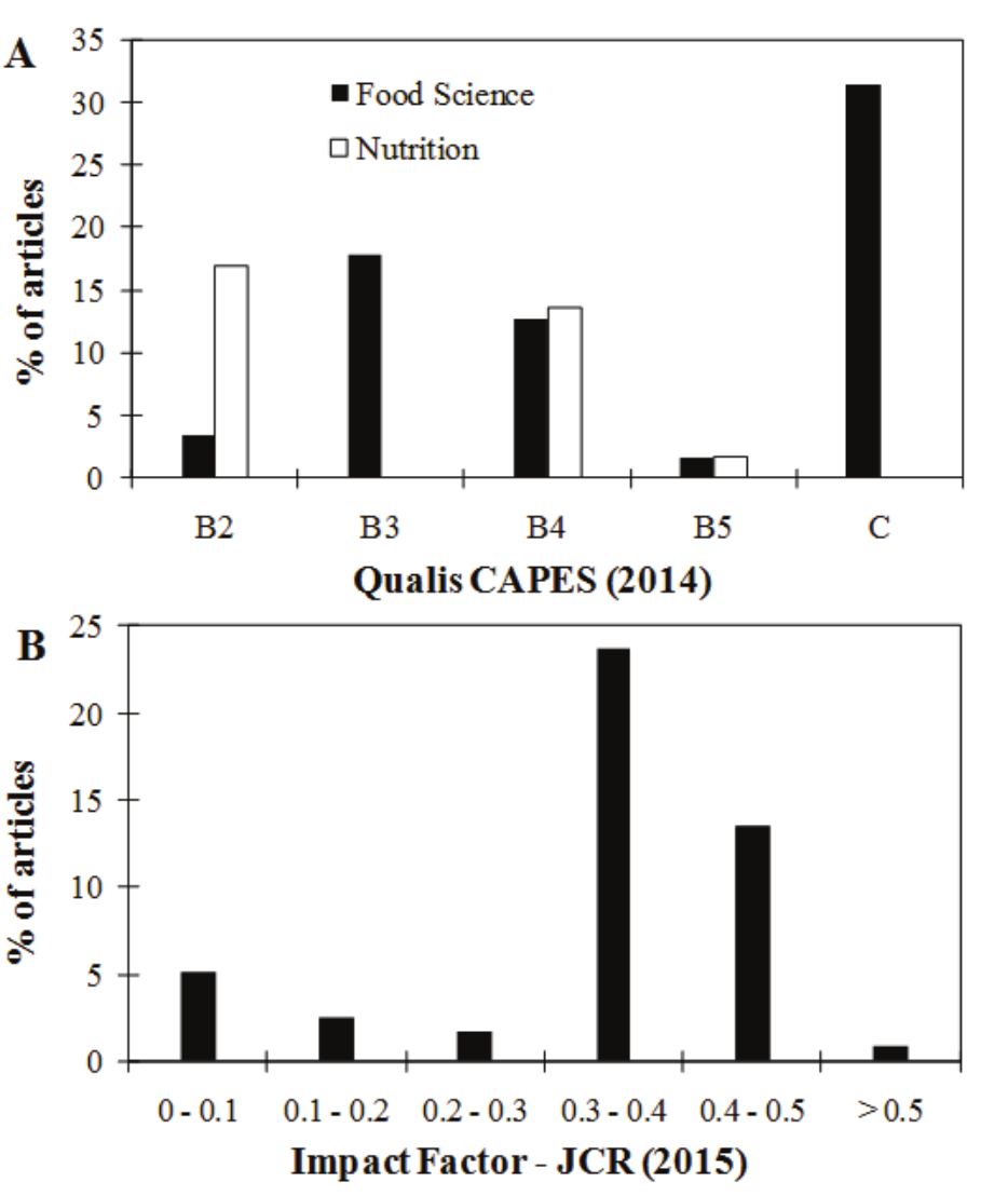 An important parameter is the articles classification in the Qualis Capes, based on the journals where they are published. The journals classification is made by each evaluation area, updated annually. The classification has a quality range between A1, highest, A2, B1, B2, B3, B4, B5 and C, the latter with zero weight. This range is used in Brazil by Capes for the evaluation and classification of the postgraduate courses, being any other type of use outside its responsibility. This type of division does not directly reflect the quality of the published article, but rather the prestige of the journal for that particular area evaluated (Engineering II, Food Science, Nutrition, etc.). Therefore, a high quality research is advised to publish in these journals, reaching a wider scientific scope for their area of study. In the analysis carried out in this article, 67% of papers were published in periodicals with Qualis in the area of Food Science and Technology, with the majority characterized by Qualis C, not very significant in terms of evaluation. For the Nutrition area, only 32% were evaluated by Qualis, mostly between B2 and B4, which represents a reasonable percentage (Figure 5a).