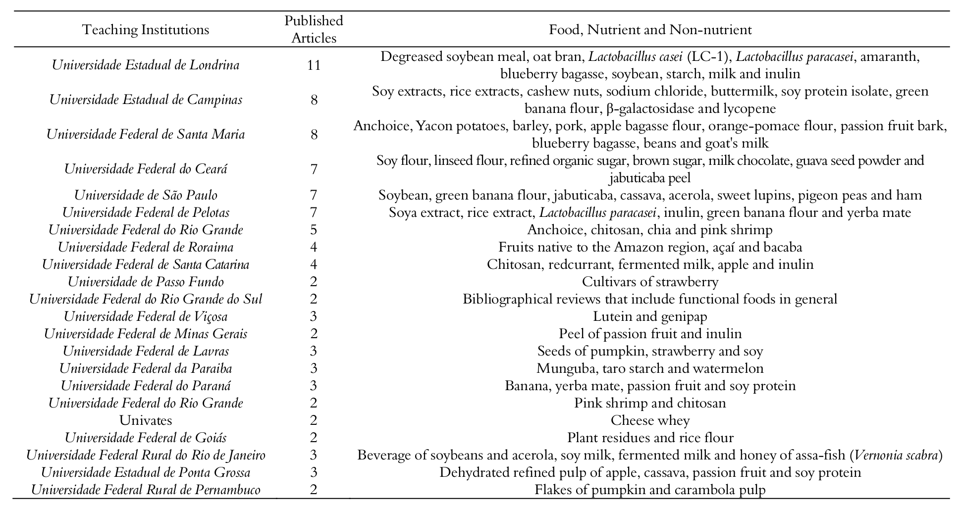 From the 62 educational institutions, it was possible to relate those that had a higher frequency of published articles with the typologies of food studied in each one (Table 1). The most expressive universities in national scientific production on functional foods were the Universidade Estadual de Londrina (UEL), Universidade Estadual de Campinas (Unicamp), Universidade Federal de Santa Maria UFSM), Universidade Federal do Ceará (UFC), Universidade de São Paulo (USP) and Universidade Federal de Pelotas (UFPel), traditional Brazilian institutions.