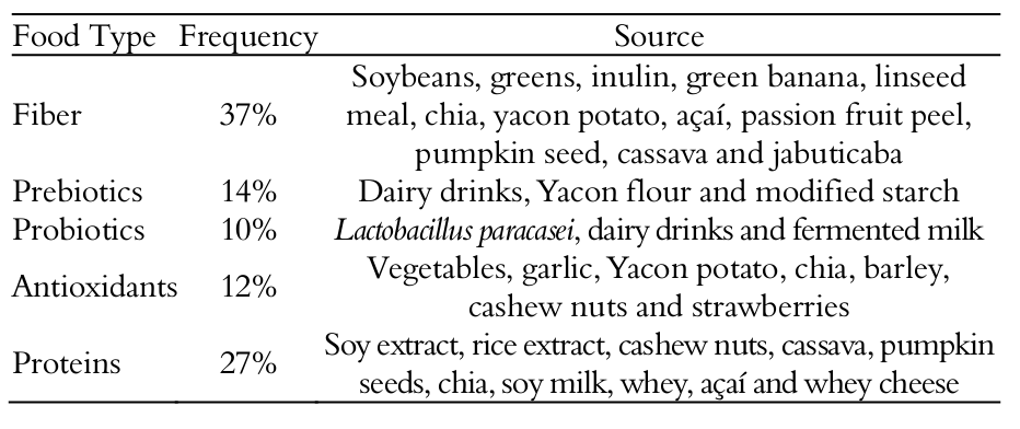 The main foods published in the Brazilian journals by these institutions, also detailed in Table 1, were evaluated and compared with the Brazilian legislation for functional foods. Foods of animal and plant origin, as well as nutrient and non-nutrient components were mentioned, and a diversity of studies on the subject was verified.