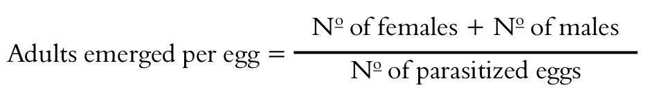 We evaluated the following biological parameters of T. pretiosum: parasitism percentage by counting the darkened eggs; emergence percentage, emergence percentage by counting of adults; viability percentage acquired by counting the host eggs that had outlet orifice of the adults viewed under a stereoscopic microscope; number of adults emerged per egg calculated using the formula: