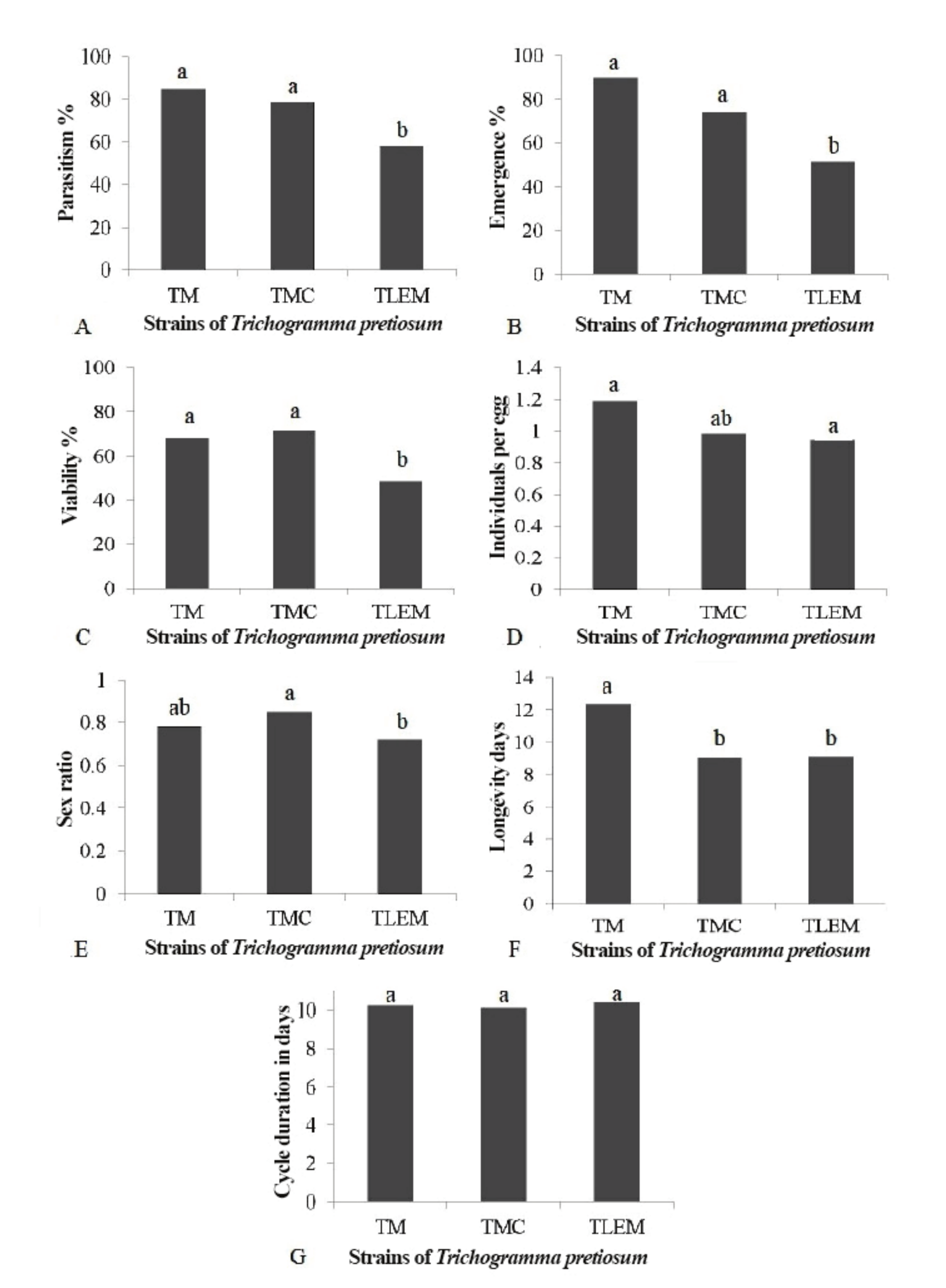 When analyzing the performance of the three strains of Trichogramma pretiosum, there were differences in the evaluated parameters. For parasitism, we observed differences in the aggressiveness of the strains evaluated on the H. armigera eggs being TM and TMC the superior strains in relation to TLEM, respectively (Figure 1A).