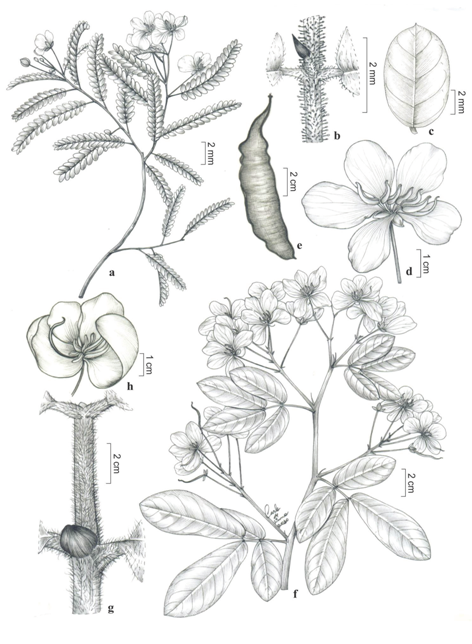 Subshrubs, shrubs or trees. Indumentum constituted of trichomes glandular or tector, present or absent. Stipules entire, persistent or deciduous, oblanceolate to subulate. Leaves alternate, spiral or distichous; petiolate or subsessile, presence of pulvinus; extrafloral nectaries absent or present, convex, sessile or stipitate, located between the pairs of leaflets or on the petiole; leaflets 1-many pairs, papyraceous to coriaceous, elliptic to oblong, lanceolate to obovate, apex acuminate, rounded to mucronate, base oblique. Inflorescences axillary or terminal, racemose, 2-33-flowered; bracts persistent or deciduous; bracteoles absent; flowers zygomorphic or asymmetric; Sepals 5, two smaller and three larger; petals 5, yellow or orange base; stamens 7, heteromorphic, 4 smaller median, subsessile, fillet erect, 2-3 abaxial larger, 2 laterals, fillets curved, twice the length of the anthers, 1 central, fillet erect, less than anther, 3-4 adaxialstaminodes or or absent, anthers dehiscent through apical sutures. Legume cylindrical, linear and oblong, plane-compressed, dehiscent or indehiscent, dehiscence inert; seeds seeds oblong, obovate, piriform or romboid.