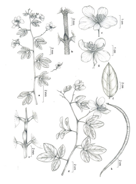 The species can easily be distinguished from the other species of the area by viscous branches, leaves with 18–20 pairs of leaflets, 1–3 extra floral nectaries localized on the rachis between the proximal pairs to leaflets and dry plane-compressed fruits.