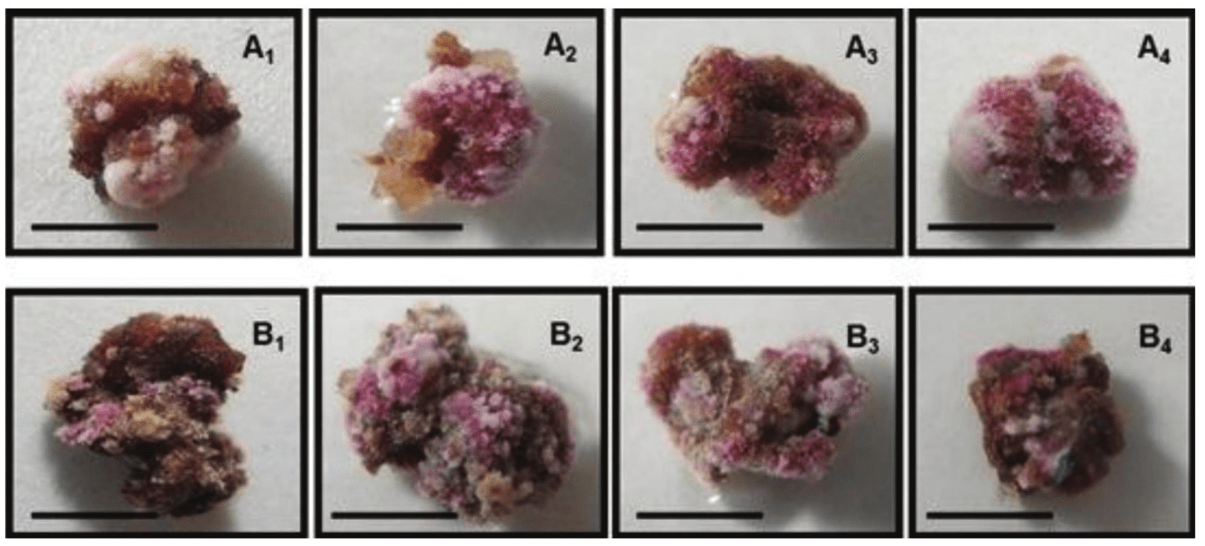 Lage, Tirado, Vanicore, Sabino, and Albarello (2015) emphasize that cell suspensions and calli are considered the most efficient biotechnological techniques for in vitro production of special metabolites, favoring the formation of a more homogenous system with high cellular proliferation with potential for large-scale production of these pigments.