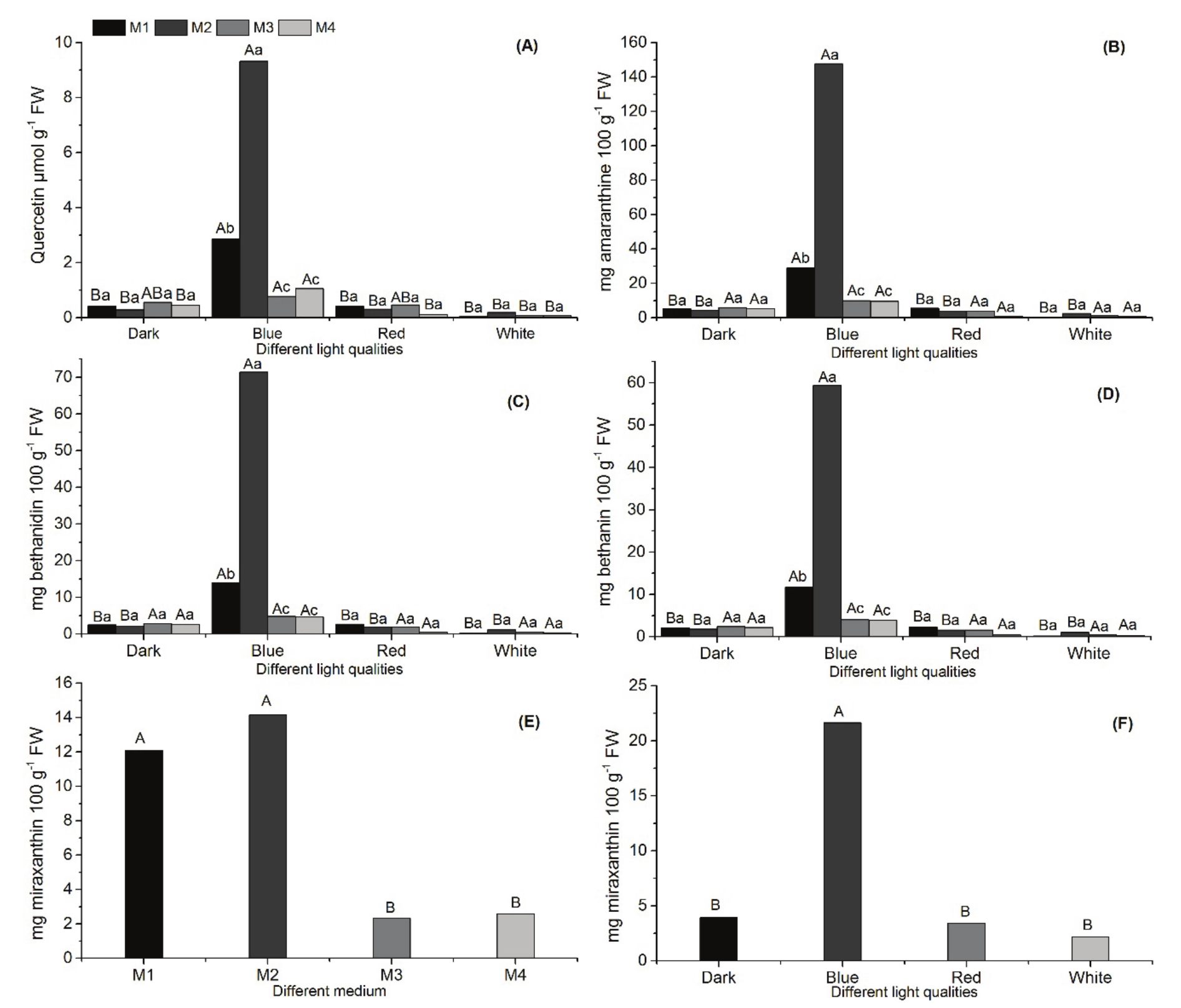For the betaxanthin levels (Figure 2E and 2F), it was possible to observe that the interaction between the callus cultivation medium and blue light was not significant, with only the isolated parameters being significant. The cultivation media known as M1 and M2 were more efficient in the production of betaxanthins. With regards to light quality, blue light was significantly better, having resulted in an increase of up to 10 times the miraxantin content compared with the white treatment. Bhuiyan, Murakami, and Adachi (2002), by evaluating cell cultures of the Portulaca sp genus, also observed an increase in this parameter when the plants were exposed to blue light.