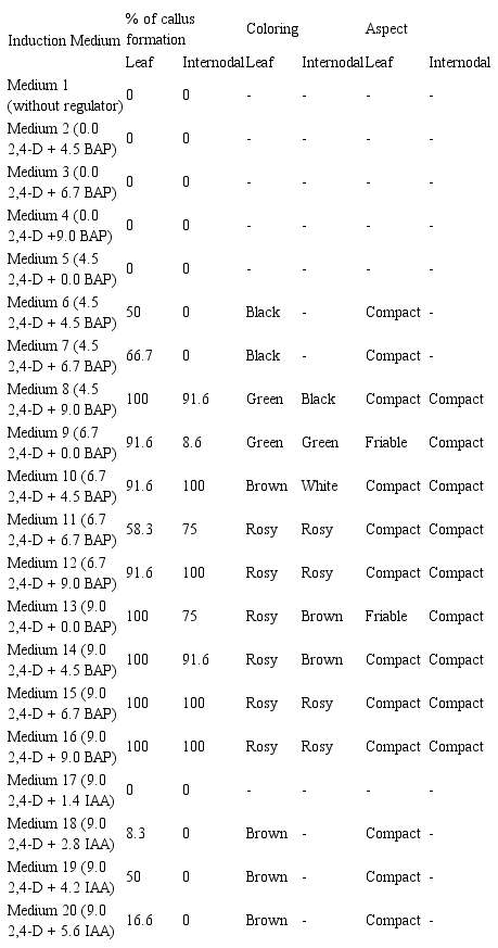 Leaf and internodal explants originated from aerial parts of plants cultivated in vitro in MS medium (Murashige & Skoog, 1962) were used to induce calli. Therefore, MS medium containing 100 mg L-1 of mioinositol, 30 g L-1 of sucrose, 7 g L-1 of agar, and pH adjusted to 5.8 was used. The media were supplemented with 2,4-D, in 0.0, 4.5, 6.7, and 9 µmol L-1 concentrations, and BAP in 0.0, 4.5, 6.7, and 9 µmol L-1 concentrations, totaling 16 types of cultivation medium. Moreover, combinations of 2,4-D (9 µmol L-1) x IAA (1.4, 2.8, 4.2, and 5.6 µmol L-1) were tested, totaling four types of medium. Petri dishes were randomly distributed with occasional rotation and kept in the dark at 25 ± 2° C for 20 days and then transferred to light for 10 days where they were kept a 16 hours photoperiod at 25° C ± 2 (Reis et al., 2017).