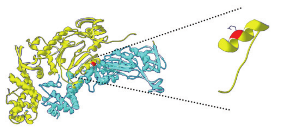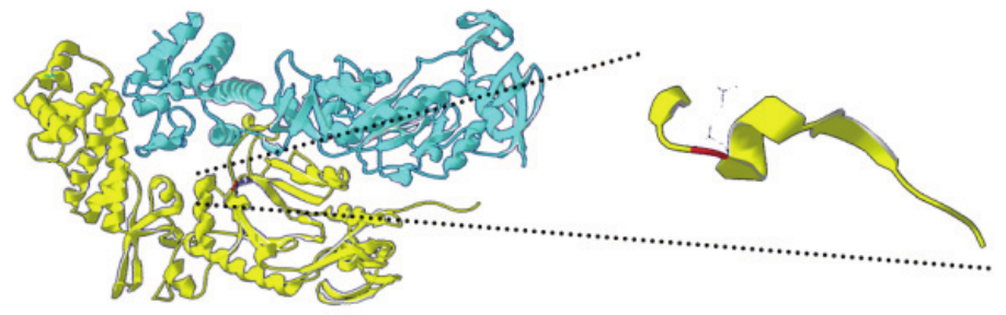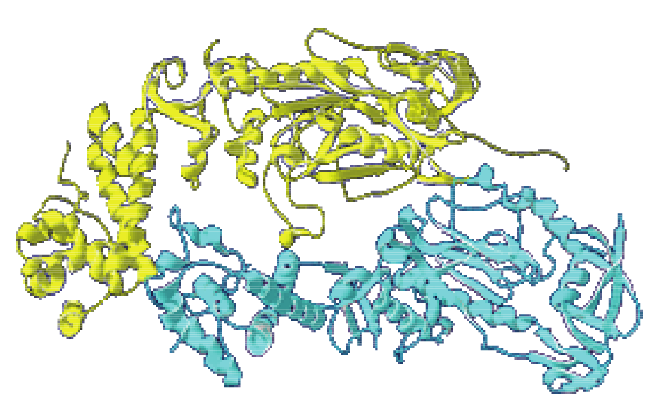 Structure of Sso primase core before mutation through DeepView. Large subunit colored in yellow; Small subunit colored in blue.