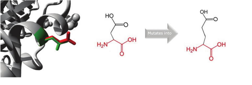 Molecular view of the amino acid substitution (mutation) (Asp) 62 (Glu). The protein is colored grey, the side chains of both the wild-type and the mutant residue are shown colored green and red respectively.