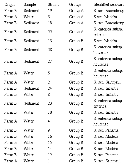 In this study, 20 strains of Salmonella were used. They were isolated from two shrimp farms (Litopenaeus vannamei, adapted to fresh water). Strains were previously identified in the Enterobacteria Laboratory of Fundação Oswaldo Cruz, Rio de Janeiro. The farms (A and B), located in Jaguaruana - Ceara, Brazil, have the Jaguaribe River as their main water source, provided samples in which the following serovars and FIOCRUZ subspecies were identified: S. ser. Saintpaul (n=2), S. ser. Infantis (n= 3), S. ser. Panama (n= 2), S. ser. Madelia (n=5), S. ser. Braenderup (n=2), S. enterica subsp. houtenae (n=4) and S. enterica subsp. enterica (n=2).