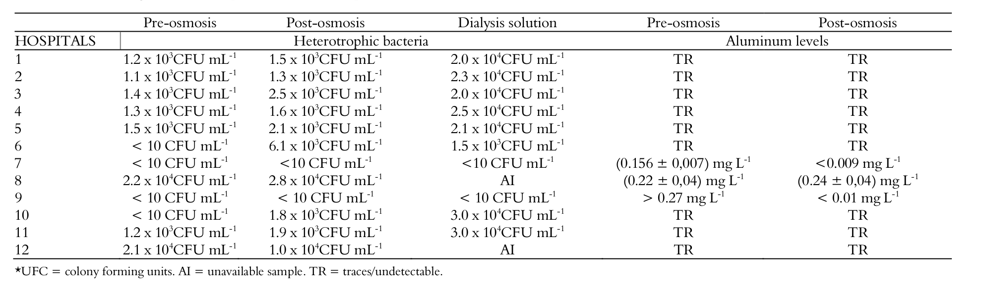 *UFC = colony forming units. AI = unavaliable sample. TR = traces/undetectableAl-Naseri, Mahdi, and Hashim (2013) found that in 60% of hemodialysis centers from Bagdad (Iraq), the bacterial counting was between 50 and 100 CFU mL-1. Also, the presence of P. aeruginosa was correlated with higher average endotoxin levels. Here, it was found relatively low but significant levels of heterotrophic bacteria (~ 2.00 CFU mL-1). Also, these microorganisms were isolated from all mobile services (hospitals) and points of collection (dialysis solution, pre- and post-osmosis water); only samples 7, 9 and 10 showed <10 CFU mL-1 on at least one collection point, however, samples 7 and 9 were among those that had higher Al levels.