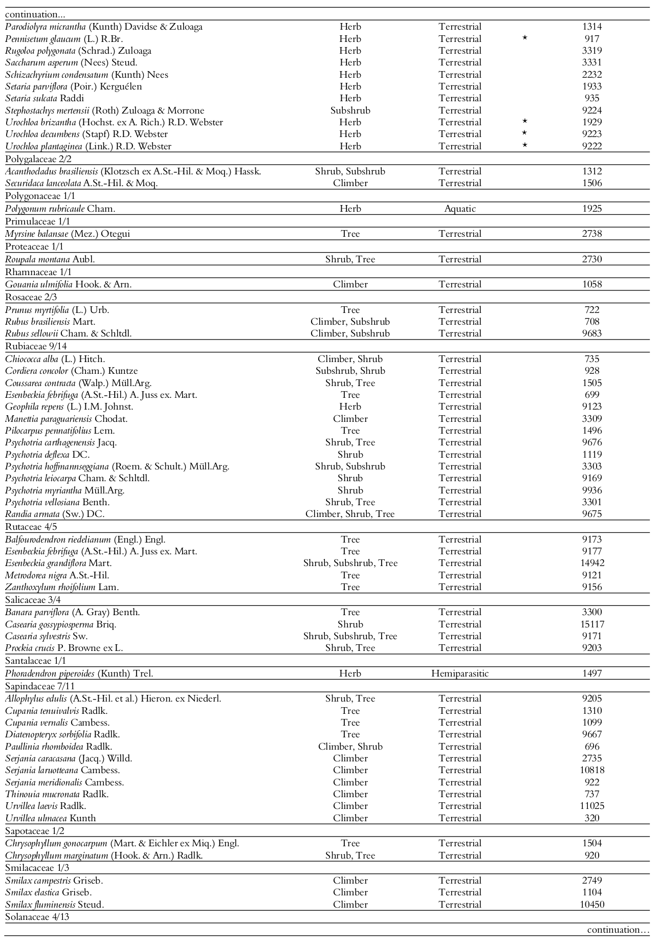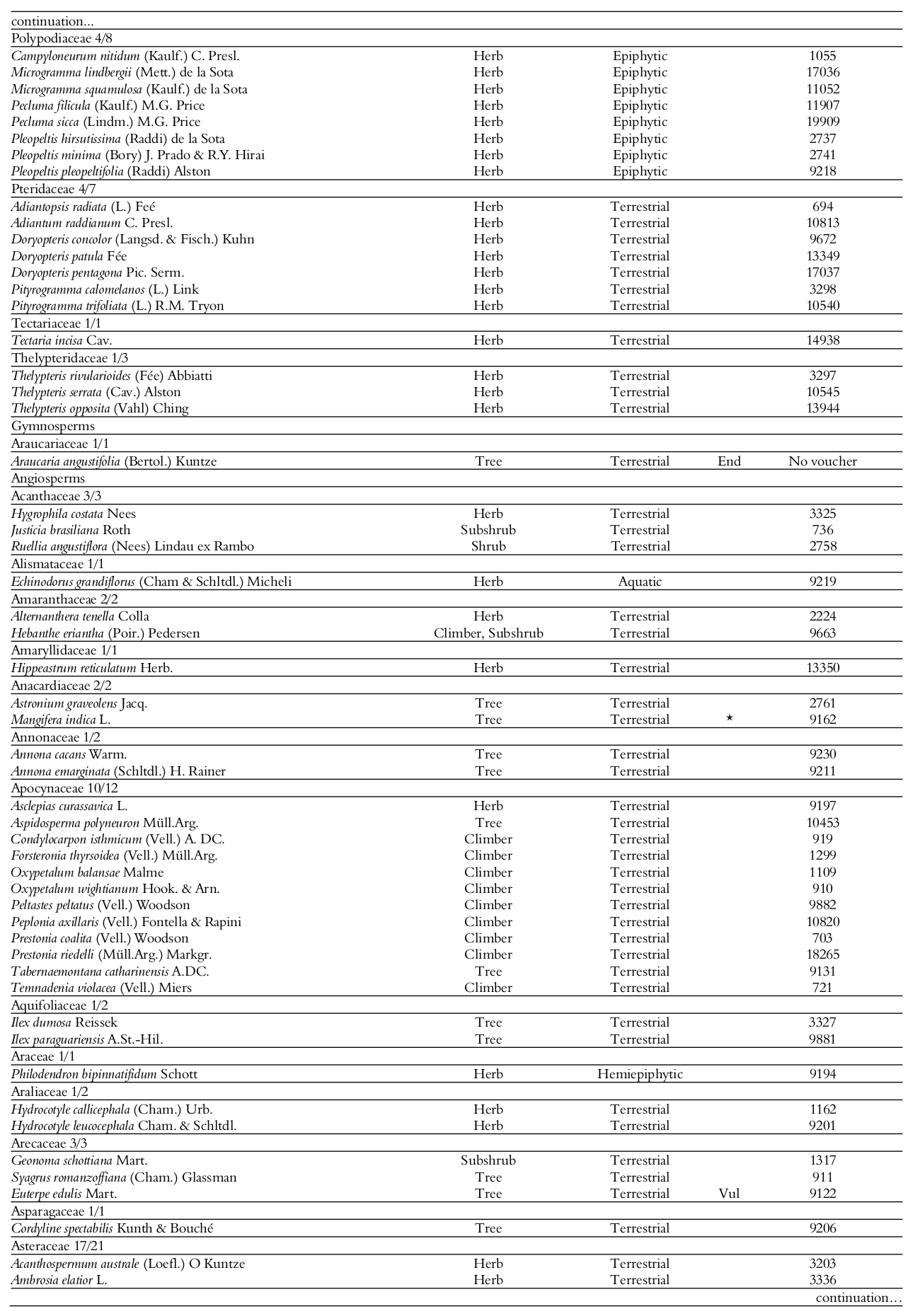 Eleven species are exotic to the State of Paraná; six are Poaceae species and other five are in Anacardiaceae, Bignoniaceae, Euphorbiaceae, Marantaceae and Orchidaceae (Table 1).
