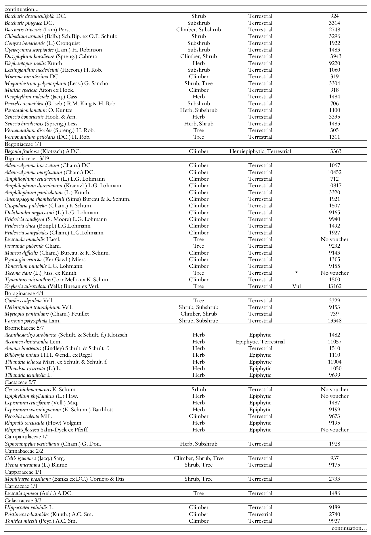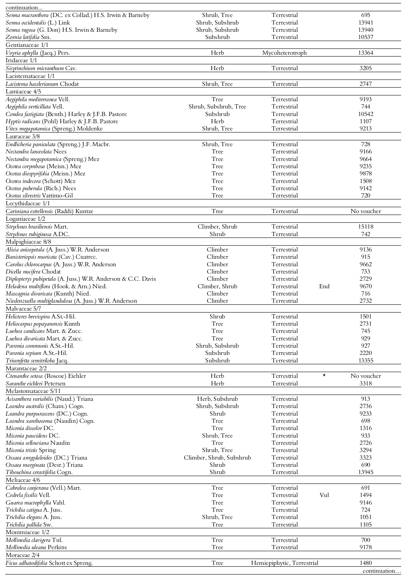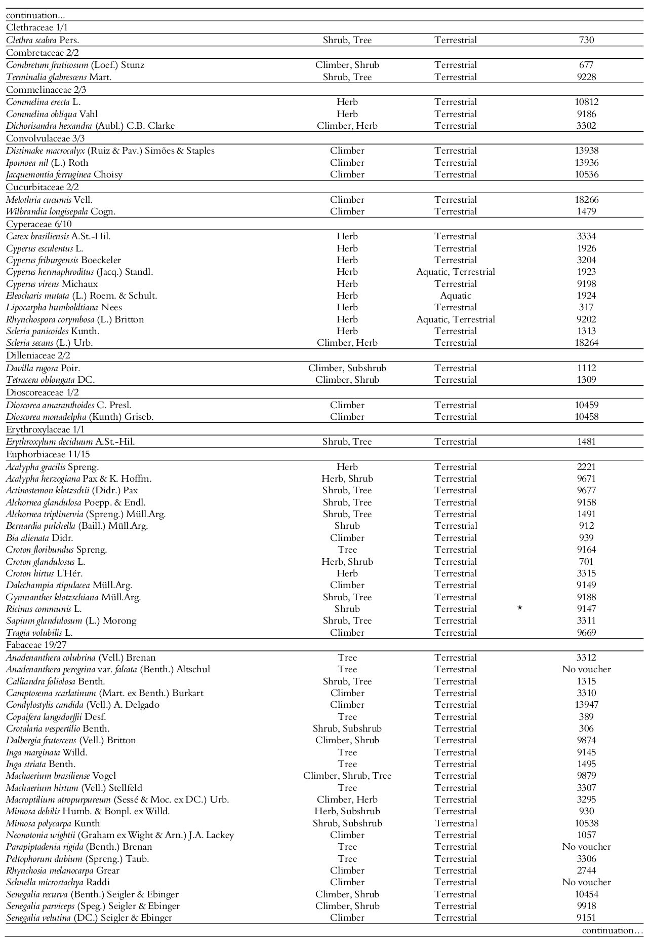 Species status (native, exotic), life form (climber, herb, shrub, subshrub, tree) and use of substrate (aquatic, epiphytic, hemiepiphytic, hemiparasitic, mycoheterotroph, rupicolous, terrestrial) was assigned according to the observed on the field and database of Flora do Brasil (2017).