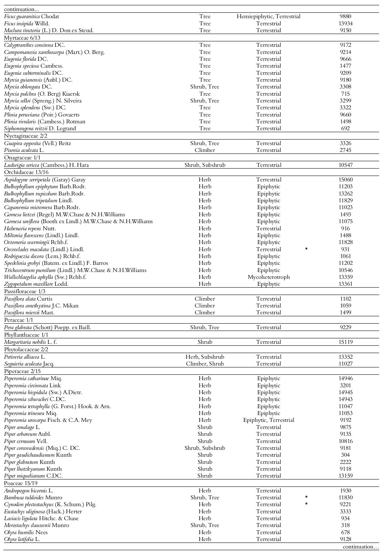 The genera with the highest number of species were Piper L., Solanum L. (8 spp. each), Peperomia Ruiz & Pav. (7 spp.), Psychotria L. (6 spp.), Myrcia DC., Ocotea Aubl. (5 spp. each), Cyperus L., Miconia Ruiz & Pav. and Asplenium L. (4 spp. each). Fifty-one genera were represented by three species, 46, by two species and 221 by one species.