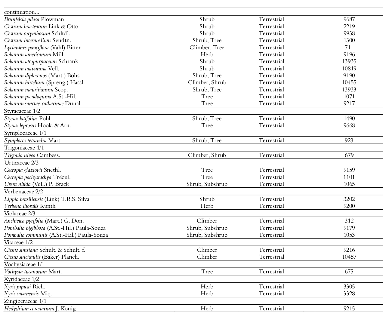 Life form and use of substrate are summarized in Table 2. Most species were herbs and trees, followed by shrubs and climbers. Subshrubs had a lower number of species in the study area. Nearly 22% of species showed variable life forms. Concerning the use of substrate, terrestrial was the most representative, followed by epiphytic species that accounted for 10% of all recorded species. Aquatic, hemiepiphytic, mycoheterotroph and hemiparasitic species were poorly represented in this area. The number of species with variable use of substrate was low (1.7%).