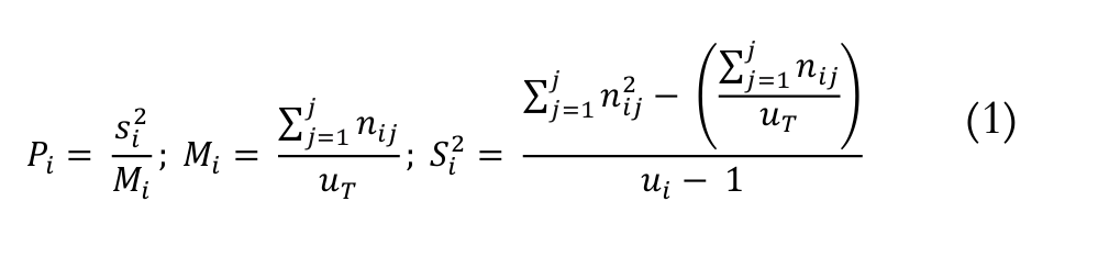 Payandeh Index (Pi): Estimating this index, it is obtained the species's aggregation degree through the relationship between the variance of the number of trees per parcel and the average of the number of trees (Payandeh, 1970), according Equation 1:
