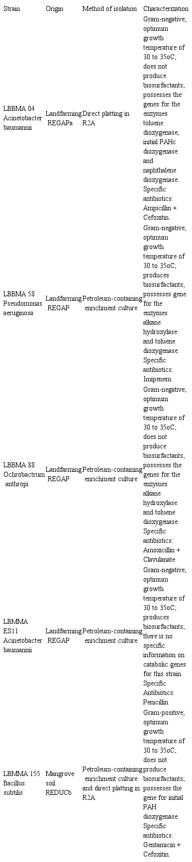 The microbial strains used in this study were Acinetobacter baumannii LBBMA 04, Pseudomonas aeruginosa LBBMA58, Ochrobactrum anthropi LBBMA 88b, Acinetobacter baumannii LBBMA ES11, and Bacillus subtilis LBBMA 155, all were isolated from hydrocarbons-contaminated sites (Table 1). The presence of genes involved in PAH degradation present in these bacterial isolates was performed in previous studies (unpublished data in scientific periodic).