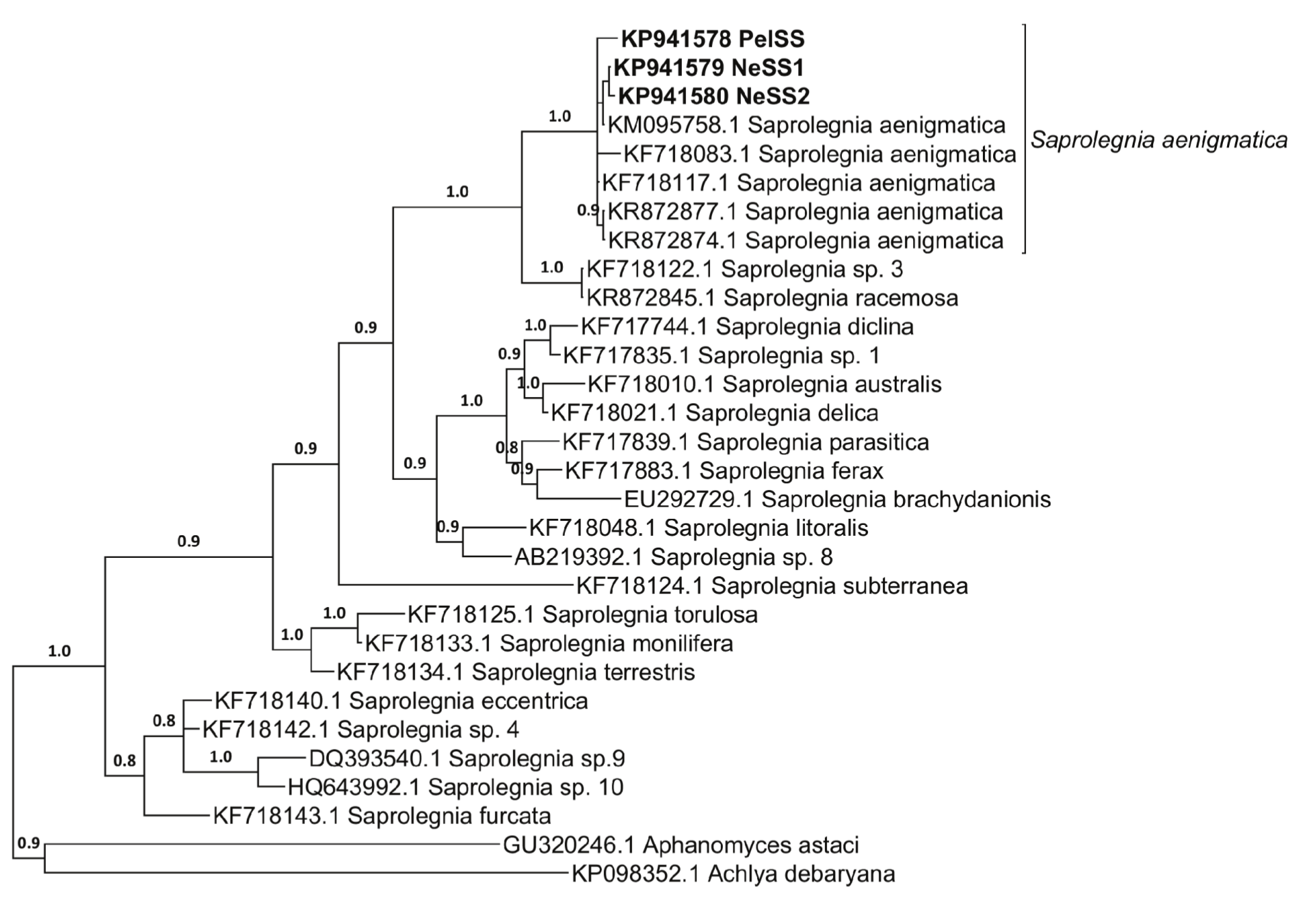 Saprolegnia aenigmatica was recently identified by Sandoval-Sierra and Diéguez-Uribeondo (2015) and according to them, more than 60% of S. aenigmatica isolates are sterile; that is, they do not form sexual structures, and the features observed are not species specific. However, the three strains in this research (PelSS; NeSS1 and NeSS2) produced sexual structures, and all shared 100% similarity with S. aenigmatica.