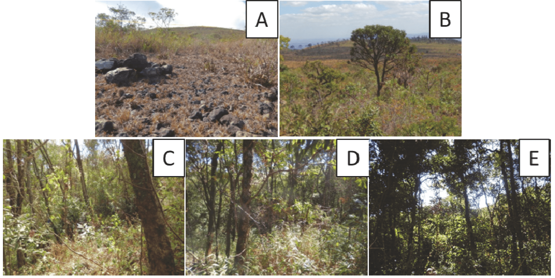 We allocated 25 sampling units of 400 m2 equally divided among five Forest vegetation types found in the SRMSP, five sample unit in each one: Canga (CG) or Ferruginous Savanna, Rock Savanna (RS), Semi-deciduous seasonal forest (SSF), Ecotone between ferruginous Savanna and semideciduous seasonal forest (EFSSF) and Ecotone between rock Savanna and semideciduous seasonal forest (ERSSF). The plots were randomly distributed within the physiognomies, with the condition that they were not contiguous. The CG and RS vegetation types are found in the highest areas of the park, being associated with shallow soils, high insolation and low vegetation. The SSF are located in the valley bottoms and in drainage lines in the form of forest capons in which the humidity is higher and the soils are deeper. Ecotone vegetation types consist of narrow transition bands between the core areas of the mentioned units, being located in intermediate points of the landscape. The adoption of the nomenclature presented for ecotones was based on directly adjacent physiognomies such as Rock Savanna and Semideciduous Forest in the case of EFSSF.