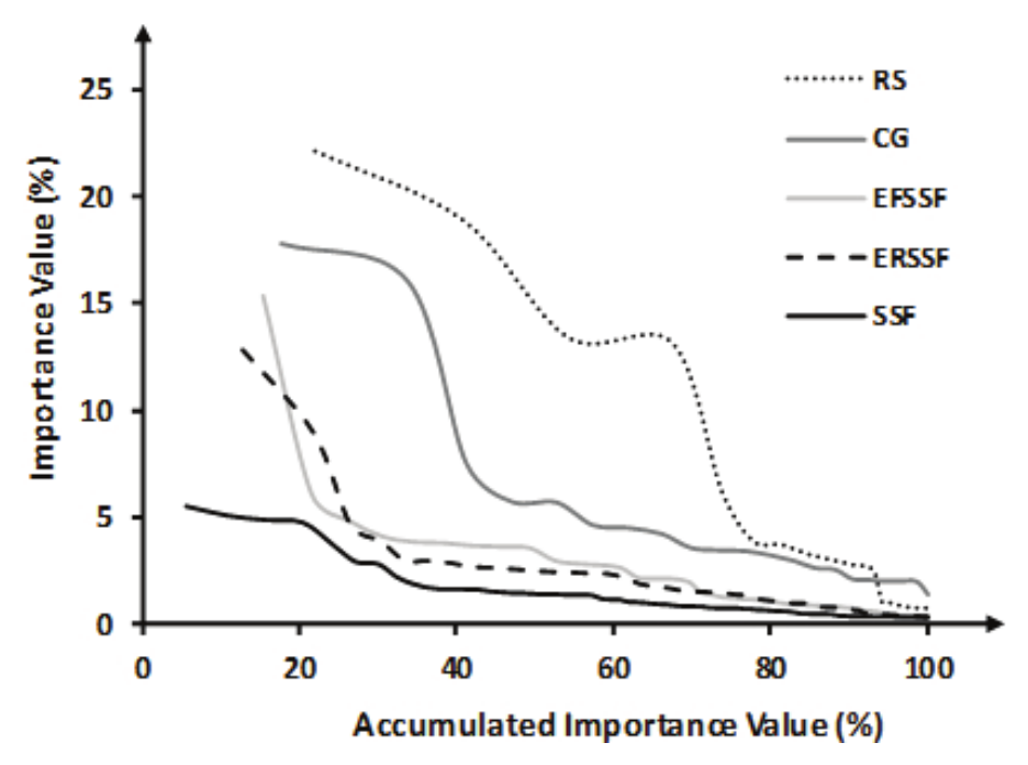 In relation to the ecological dominance, CG presented an intermediate behavior between ecotones (EFSSF and ERSSF) and RS, with higher concentration of IV. Ecotones (EFSSF and ERSSF) presented similar dominance patterns with each other and were different from SSF, with the lowest IV concentration in the system (Figure 4), explained by the magnitude of variation of IV. Thus, three structurally different groups were formed: one with EFSSF and ERSSF, another with isolated SSF and the last with CG and RS, which differed from the others and not from each other.