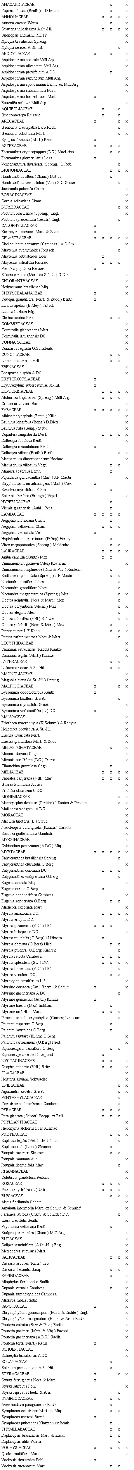 The floristic dissimilarity among the vegetation types was evaluated by obtaining the number of shared species and Jaccard similarity coefficients (1-J) (Jaccard, 1908, Real & Vargas, 1996) among vegetation types. Then, we performed a permutational multivariate analysis of variance (Permanova) (Clarke, 1993) at 0.05 significance level in order to test if ferruginous Savanna differs floristically from the others vegetation types based on coefficients. Finally, we performed a detrended correspondence analysis (DCA) (ter Braak, 1995) to evaluate indirectly the existence of gradients based on the abundance of species in the sample units. The analyses were performed through the software R Studio v. 3.3.1 (R Core Team, 2016) and the ‘Vegan’ package (Oksanen, 2011).