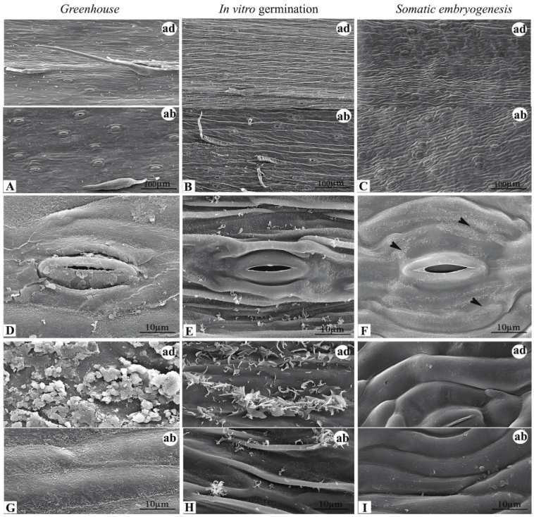 Abstract: In vitro cultures of peach palm (Bactris gasipaes Kunth) were established by somatic embryogenesis but some improvements in maturation and conversion steps are still needed. The aim of this study was to analyze morpho-anatomical differences in peach palm leaves from greenhouse cultured plants, in vitro plants developed from in vitro germinated seeds and somatic embryo-derived plants. Expanded leaves were prepared for histological analyses and scanning electron microscopy. No significant difference was found between ex vitro and in vitro cultured plants, but the somatic embryo-derived plants showed structural alterations of the leaves. The epidermal cells were elongated in shape, the mesophyll cells were thicker and the vascular bundle was not very developed. In somatic embryo-derived leaves the cuticle was thinner than in other leaves and epicuticular wax was present but poorly deposited. In in vitro cultured plants, the deposition of epicuticular wax on the leaves was irregular while in the greenhouse plants it was regular and abundant. These alterations in somatic embryo-derived leaves could hinder the acclimatization and development of peach palm plants so it is necessary to improve the protocol for somatic embryogenesis to produce better plants.