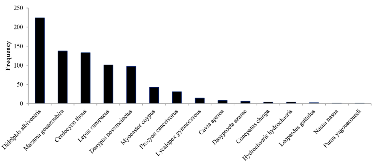 We recorded 15 mammal species, belonging to 10 families (Table 1, Figure 2), with Carnivora accounting for 46.6%, Rodentia for 20%, and Didelphimorphia for 13.3%. When sampling methods were analyzed, Mazama gouazoubira, Lepus europaeus, and Myocastor coypus were the most frequent in Vs; Didelphis albiventris, Cerdocyon thous, and Dasypus novemcinctus the most frequent in plots; and M. gouazoubira, C. aperea, and C. thous the most frequent in Cs. Given the sum of all methods, D. albiventris was the most frequent species (Figure 2).