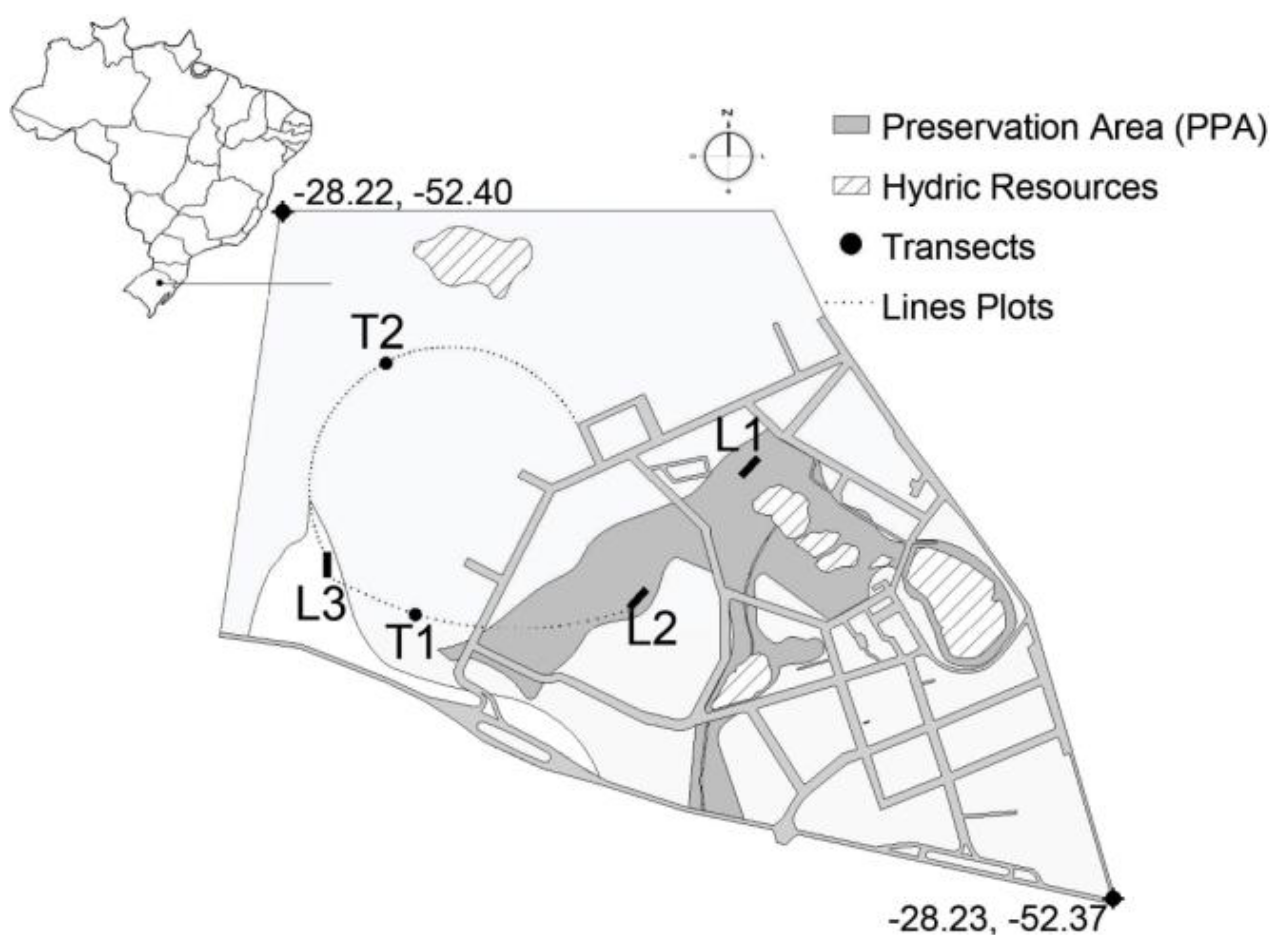 The study area has springs of water resources along permanent preservation areas (PPAs), with different degrees of conservation, and lies at the border of the urban area with the rural area of the municipality of Passo Fundo (028° 13' 51.6" S, 051° 22' 49.9" W; Datum = WGS84). The area was composed of three different APPS environments (Figure 1), covering an area of 15% of 136 hectares, in a mixed matrix of urbanized blocks (low density buildings) with asphaltic streets, green wooded areas, small fragments of forest native crops, and annual crops. Original vegetation is characterized as mixed ombrophilous, with the typical vegetation mosaic of the Araucaria Forest (Instituto Brasileiro de Geografia e Estatística [IBGE], 2012), one of the most important phytophysiognomies in southern Brazil. Altitudes range from 630 to 740 m.