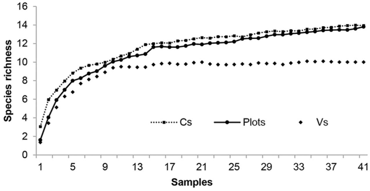 The nonparametric Kruskal-Wallis (H) test was used to compare the efficiency of each sampling method (Cs, Plots, and Vs) for species-richness (Zar, 1999).