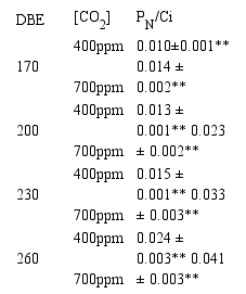 Plants grown under high [CO2] had significantly more leaves (p < 0.05) (from 200 DBE onward), and longer and thicker stems (from 170 DBE onward), than plants under ambient [CO2] (interaction between CO2 and plant age, Figure 4A, B e C).