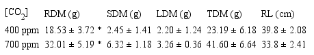 Enterolobium contortisiliquum individuals grown under high [CO2] had greater (p < 0.05) RDM (Table 3) than plants under ambient [CO2] (interaction between CO2 and plant age).