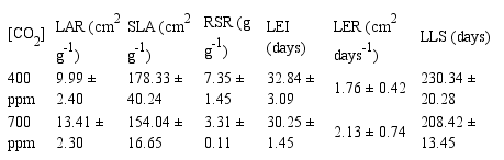 However, E. contortisiliquum plants both grown under ambient and high [CO2] did not differ (p > 0.05) significantly in biometrical index and leaf development variables (LAR, SLA, RSR, LEI, LER, and LLS (Table 4).