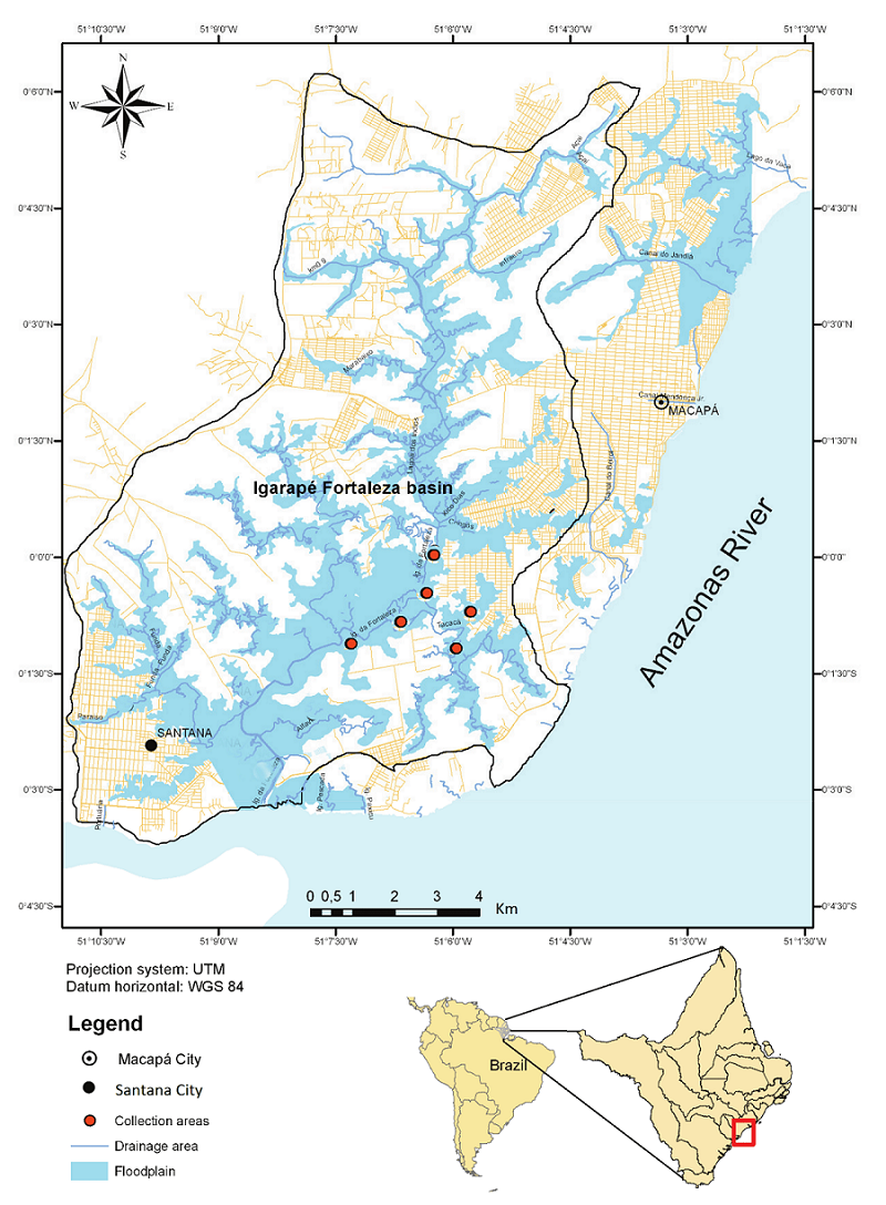 The Igarapé Fortaleza basin, located in the municipalities of Macapá and Santana (AP), is formed by a main channel and an extensive area of floodplains that suffer periodic flooding and is strongly influenced by the high rainfall of the Amazon region and the daily tides of the Amazon River, thus providing shelter and feeding for different species of fish. The regional vegetation is composed of plants with characteristics of flooded forests and herbaceous fields, and several species of macrophytes (Thomaz, Costa-Neto, & Tostes, 2004;Tavares-Dias, Oliveira, Gonçalves, & Silva, 2014).