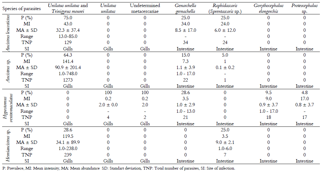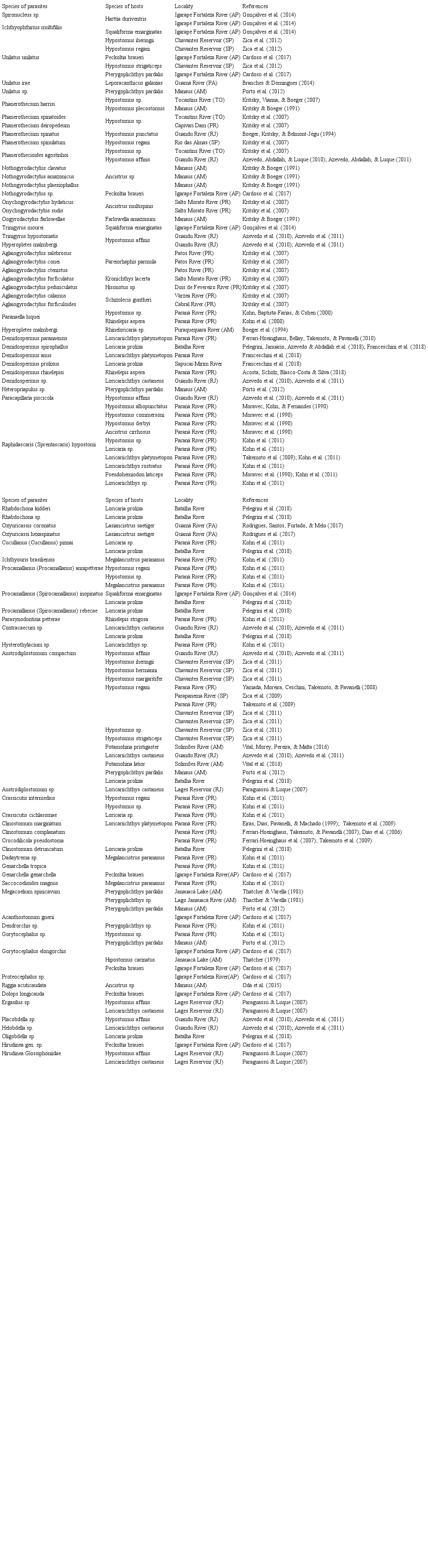 A total of 1,559 parasites were collected from 53 fish specimens, which infected gills and gut of hosts. Unilatus unilatus Mizelle et Kritsky, 1967 and Trinigyrus mourei Boeger and Bemont-Jégu, 1994 were the most frequent parasites, infecting four host species, followed by Genarchella gernachella Travassos 1928 and larvae of Raphidascaris (Sprentascaris) Peter and Cassone, 1984. Larvae of Proteocephalus Weinland, 1858 occurred only in one host species. Hypostomus ventromaculatus harbored the highest diversity of parasites, followed by Ancistrus sp. (Table 3).