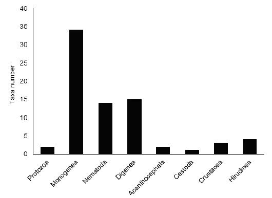 Species of Protozoa, Monogenea, Nematoda, Digenea, Acantocephala, Cestoda, Crustacea and Hirudinea were found parasitizing species of Loricariidae from Brazil, but the most frequent taxonomic groups are Monogenea, Digenea and Nematoda (Table 1). However, the greatest species richness is for Monogenea (Figure 2).